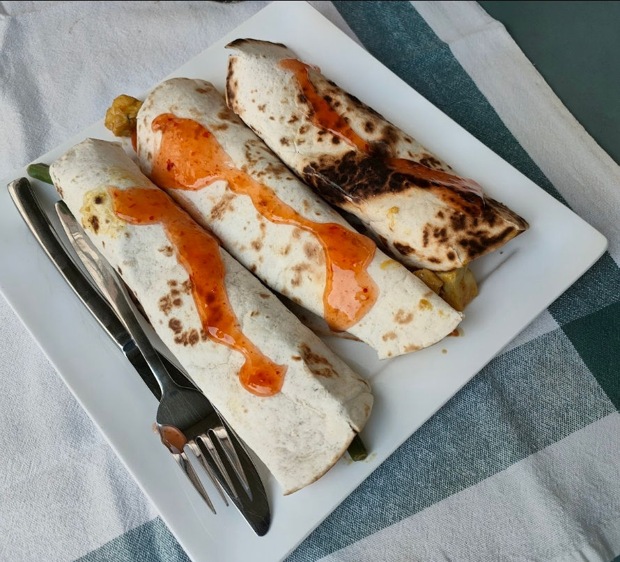 Vul tot slot de wraps met de groenten/vlees mix. Serveer ze met Chilisaus.